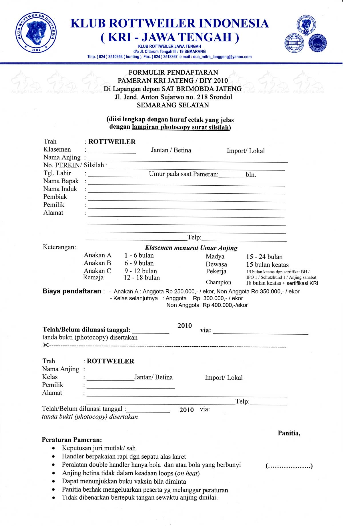 Saksikan dan ikuti pameran Klub Rottweiler Indonesia wilayah Jawa Tengah & Daerah Istimewa Yogyakarta pada hari Minggu 11 Juli 2010 bertempat di Lapangan Depan SAT BRIMOPDA Jawa tengah, jalan Jend.Anton Sujarwo 218 Srondol, Semarang Selatan.