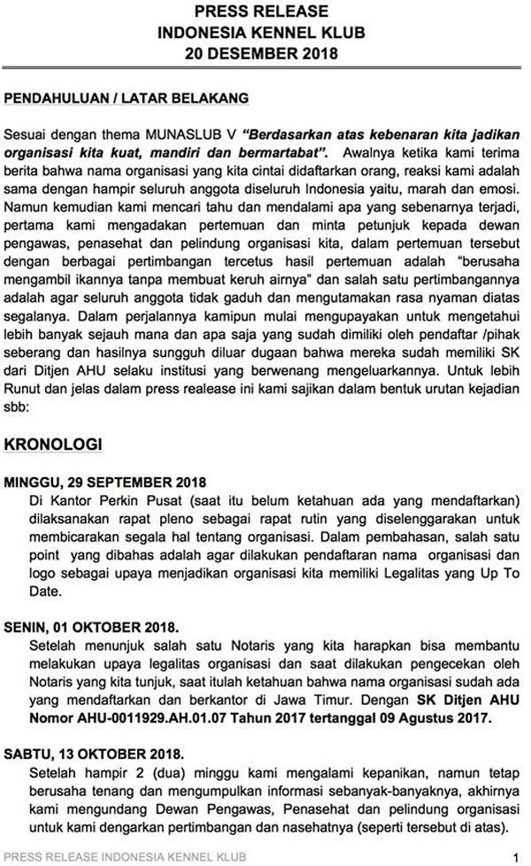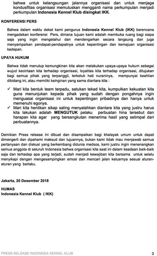 PRESS RELEASE INDONESIA KENNEL KLUB