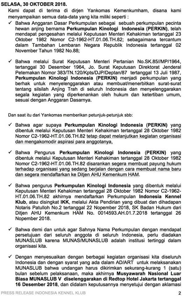 • Bahwa pengurus Perkumpulan Kinologi Indonesia yang dibentuk melalui Keputusan Menteri Kehakiman tertanggal 28 Oktober 1982 Nomor C2-1962-HT.01.06.TH.82 akhirnya mendaftarkan Perkumpulan Indonesia Kennel Klub, atau disingkat IKK, melalui Akta Pendirian yang dibuat dan dihadapan Notaris Patulloh No.2 tertanggal 22 Nopember 2018, SK Badan Hukum dari Ditjen AHU Kemenkum HAM No. 0014593.AH.01.7.2018 tertanggal 26 Nopember 2018.