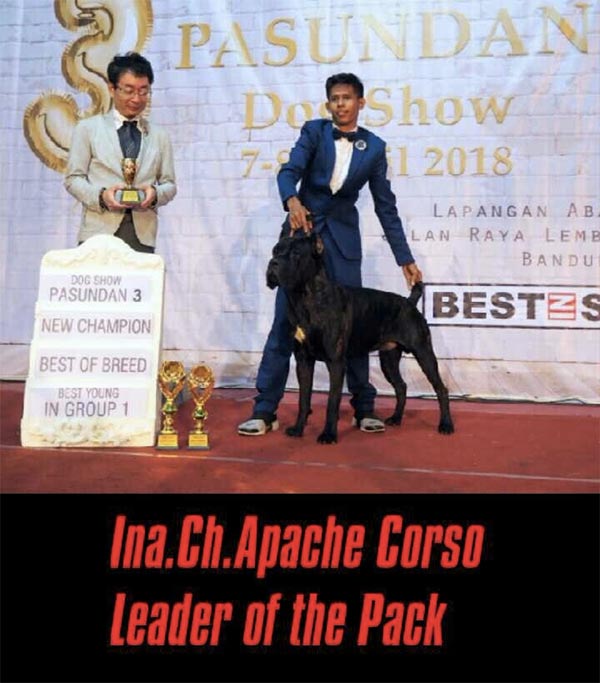 Apache adalah Pejantan Cane Corso muda tinggi besar, berukuran maximal menurut standard FCI, kepala besar,moncong tebal, badan kekar, dada lebar & tulang kasar.