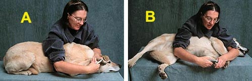 B. Untuk memotong kuku dikaki sebelah kiri sebaiknya anjing diposisikan miring. Mungkin anda memerlukan bantuan seseorang untuk memegang posisi belakang tubuh anjing sambil mengelus-elus bagian tubuh sekitar leher agar anjing dapat lebih tenang.