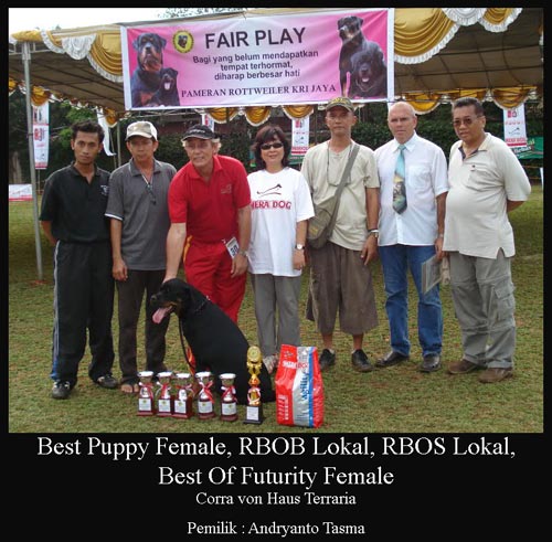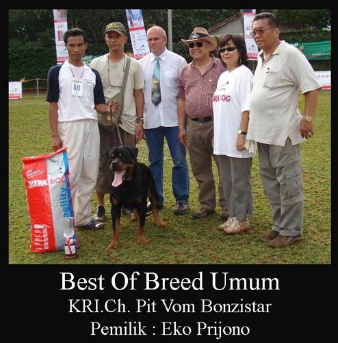 Peraih Rottweiler Jantan Indonesia Terbaik di peringkat pertama diduduki bersama 2 ekor Rottweiler yakni Pit Vom Bonzistar milik Eko Prijono Semarang & Musa vom Bonzistar milik Edi Limbono Bali. Peraih Rottweiler Betina Indonesia Terbaik diraih oleh Fuksa Jr Von Himalaya milik Husen Lumanta bandung
