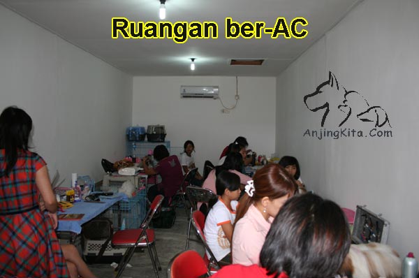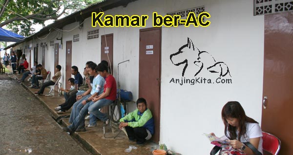 Sepertinya sudah menjadi kebiasaan para pecandu pameran, jika mengikuti pameran dengan lapangan outdoor maka mereka akan menyewa tenda ber-AC agar anjing yang sedang menunggu tidak kepanasan. Pemilik tempat menyediakan ruangan berukuran 3 x 6 meter dengan fasilitas AC seharga Rp.2 juta untuk 2 hari sehingga peserta tidak perlu menyewa tenda ber-AC yang biasanya seharga Rp.4-6 juta untuk 2 hari pameran. Ruangan memang terkesan sangat sederhana, lantai tanpa keramik hanya coran semen saja tapi kondisinya cukup bersih dan AC yang terpasang sanggup mendinginkan ruangan tersebut. Kalau tidak salah menghitung, tersedia 13 ruangan untuk disewakan dan diantaranya ada yang berukuran 2 kali lipat sehingga untuk peserta yang membawa anjing yang cukup banyak atau peserta yang bergabung untuk menyewa kamar tersebut tidak kekurangan tempat. Peserta yang tidak menyewa kamar berpendingin AC juga tetap nyaman karena panitia menyediakan tempat menunggu disekeliling ring yang bertenda sehingga tidak kehujanan .