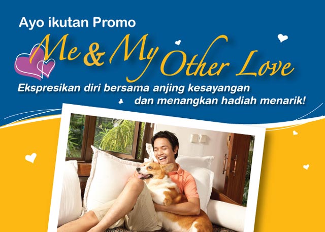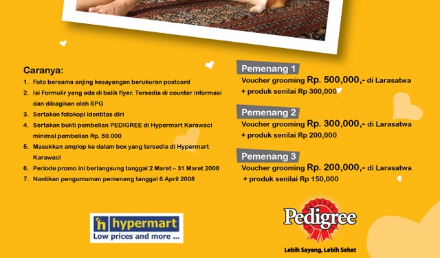 Ayo ikutan Promo “Me & My Other Love”.Ekspresikan diri bersama anjing kesayangan dan menangkan hadiah menarik!Promo ini hanya berlaku pada setiap pembelian produk PEDIGREE di Hypermart Supermall Karawaci dari tanggal 2 Maret2008 sampai 31 Maret 2008.Pengumuman nama pemenang akan dilakukan pada tanggal 6 April 2008.