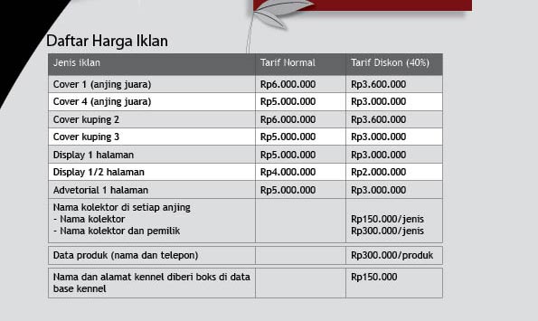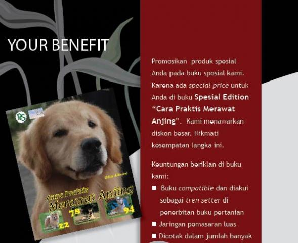 Promosikan produk spesial Anda pada buku spesial kami. Karena ada special price untuk Anda di buku “Spesial Edition” ini. Kami menawarkan diskon besar bagi Anda untuk memasang iklan anjing juara, kennel anjing, dogfood, obat-obatan, produk kesehatan, petshop, dll. Nikmati kesempatan langka ini.