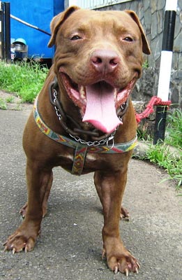 Baron pure bred APBT which has a medium size,big blocky head, stable disposition, high pain tolerance, agility, totally fearless, soundless, and he always friendly towards people.
