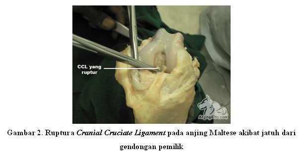 Putusnya CCL sering terjadi pada anjing. Kasus ini dapat dialami oleh semua ras anjing, dan kadang-kadang dijumpai pada kucing. Ruptura CCL ini dapat dijumpai pada anjing-anjing muda maupun dewasa, dan pada ras besar seperti Labrador retriever, Golden retriever, Rottweiler, dan Mastiff dapat mengalami ruptura cruciate ligament pada saat masih puppies. Penyebab putusnya CCL belum diketahui secara pasti, akan tetapi menurut penelitian, struktur anatomi kaki belakang dan faktor genetik memegang peranan penting. Beberapa kasus ruptura cruciate ligament yang datang ke tempat praktek saya memiliki riwayat trauma akibat jatuh dari suatu ketinggian (jatuh dari gendongan dan jatuh dari lantai atas).