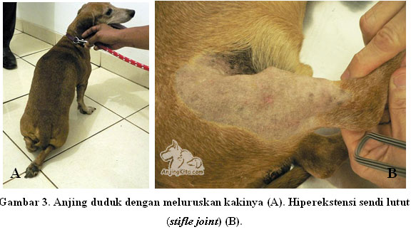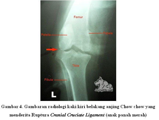 Ruptura CCL dapat diketahui dari anamnesa, gejala klinis, maupun pemeriksaan-pemeriksaan pendukung seperti x-ray, joint fluid analysis, arthroscopy, USG, dan MRI. Klien datang dengan keluhan anjingnya berjalan pincang. Anjing biasanya duduk dengan meluruskan kaki yang bermasalah (Gambar 3A). Pemeriksaan klinis dilakukan dengan cara menggerakkan tulang femur dan tibia ke atas dan ke bawah (drawer movement) pada posisi anjing terlentang, terjadi gerakan hiperekstensi persendian lutut (Gambar 3B), dan sendi lutut terasa kendor. Pemeriksaan klinis tersebut dapat diperkuat dengan membuat foto rontgen kaki belakang dengan posisi terlentang. Hasil foto rontgen kaki yang bermasalah kadang-kadang menunjukkan adanya penyempitan celah antara tulang femur dan tibia (Gambar 4).