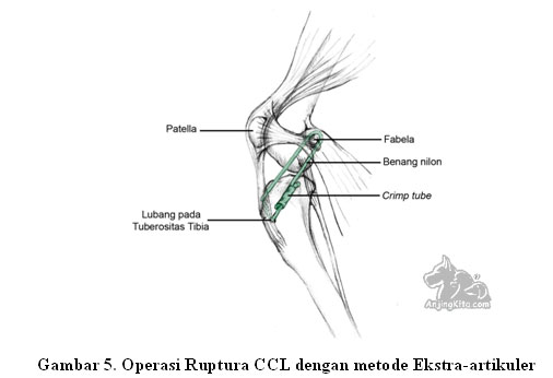 Metode ini digunakan untuk anjing-anjing ras besar. Prinsip dari metode ini adalah menggantikan CCL yang telah putus dengan benang nilon. Sebelum membuat ikatan dari benang nilon, sisa CCL dan meniskus bagian medial yang telah rusak dibuang terlebih dulu. Kemudian ikatan dibuat menggunakan benang nilon dari bagian lateral fabela, selanjutnya benang tersebut dimasukkan ke dalam lubang yang dibuat pada tuberositas tulang tibia, di dekat pangkal dari ligamentum patella (Gambar 5). Ikatan yang sama dilakukan pula pada bagian medial fabela, menuju lubang yang sama pada tuberositas tulang tibia.