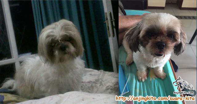 Anjing BETINA ukuran kecil, moncong pesek, breed Shih-Tzu, bulu badan warna putih, bulu muka putih sedikit coklat muda keemasan.