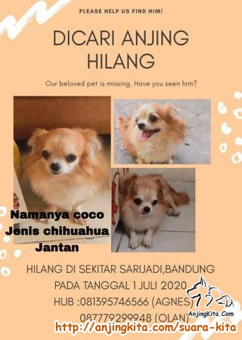 Mohon bantuannya anjing kami jenis Chihuahua namanya Coco hilang didaerah Sarijadi, Bandung. Mohon bantuannya bagi yang bisa menemukan bisa menghubungi saya dengan kontak yang ada digambar. Bagi yang menemukan akan ada apresiasi dari kita. terima kasih
