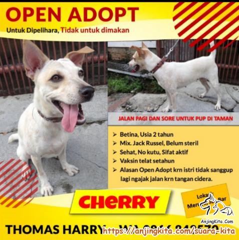 Tadinya Cherry awalnya diadopsi sekarang dia mau dioperkan lagi . Mari temen2 bila teman2 masih ada sedikit tempat di dlm rumah kalian buat satu anjing saja anjing manis sehat jinak Baik seperti cherry ini tolong adoplah cherry agar ia mendapatkan furever homenya dan keluarga baru yg bener2 tulus menyayanginya sampai maut menjemput tanpa hrs membeda-bedakan ia ras atau kampung..bagi yg serius bisa wa ke 0816842570