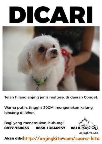 Anjing kami hilang sejak 23 Desember 2017, di daerah condet Jakarta Timur. Mini Maltese tinggi 30 cm,
