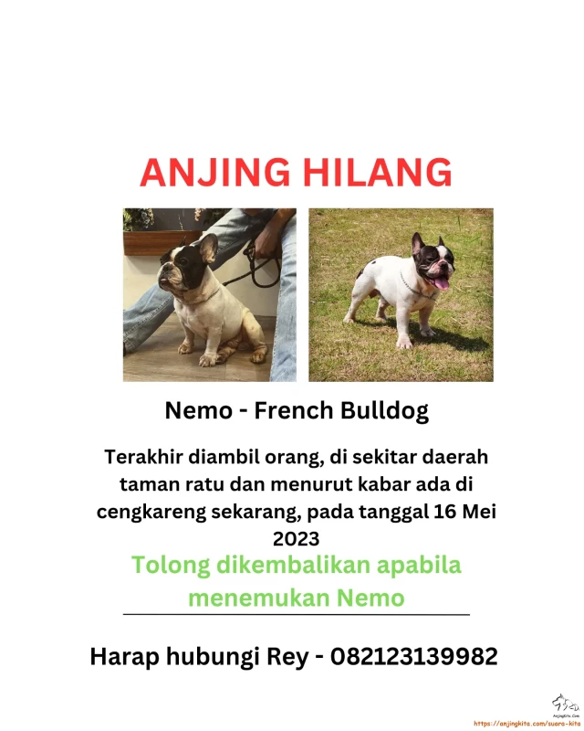 Telah hilang french bulldog pada tgl 16 mei 2023, nama nemo