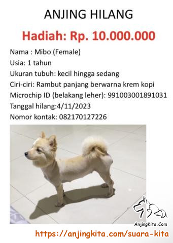 Nama : Mibo Usia: 1 tahun Ukuran tubuh: kecil hingga sedang Ciri-ciri: Rambut panjang berwarna krem kopi